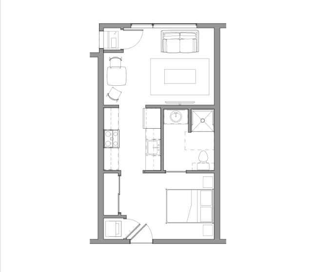 Our one bedrooms are thoughtfully designed to maximize natural light and feature high ceilings. The open-concept layout blends the living and sleeping areas, with a full-sized kitchen, so you can entertain without compromise.