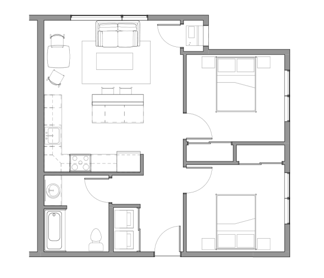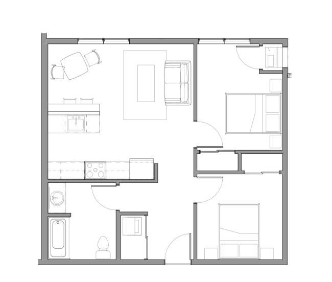 Our one bedrooms are thoughtfully designed to maximize natural light and feature high ceilings. The open-concept layout blends the living and sleeping areas, with a full-sized kitchen, so you can entertain without compromise.